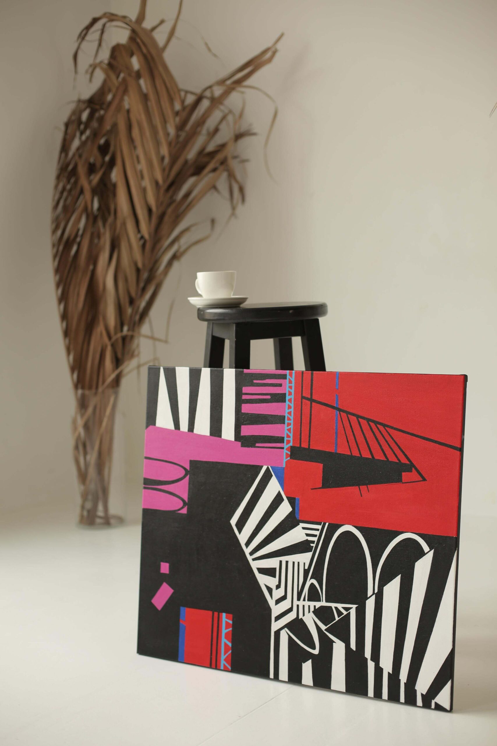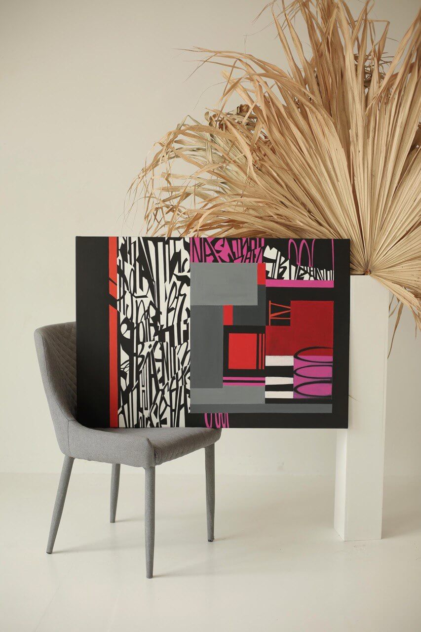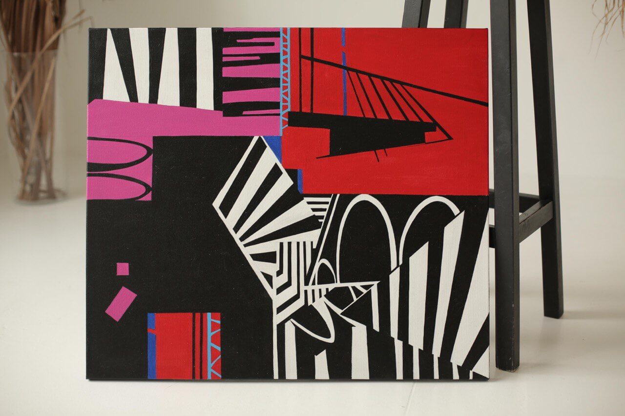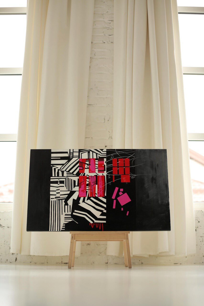 У своїх роботах використовую чисті, різкі тони та гострі кути задля технічного підсилення напруги. Графічні роботи наповнені динамікою форм, плям та ліній, концептуально обʼєднаних між собою.